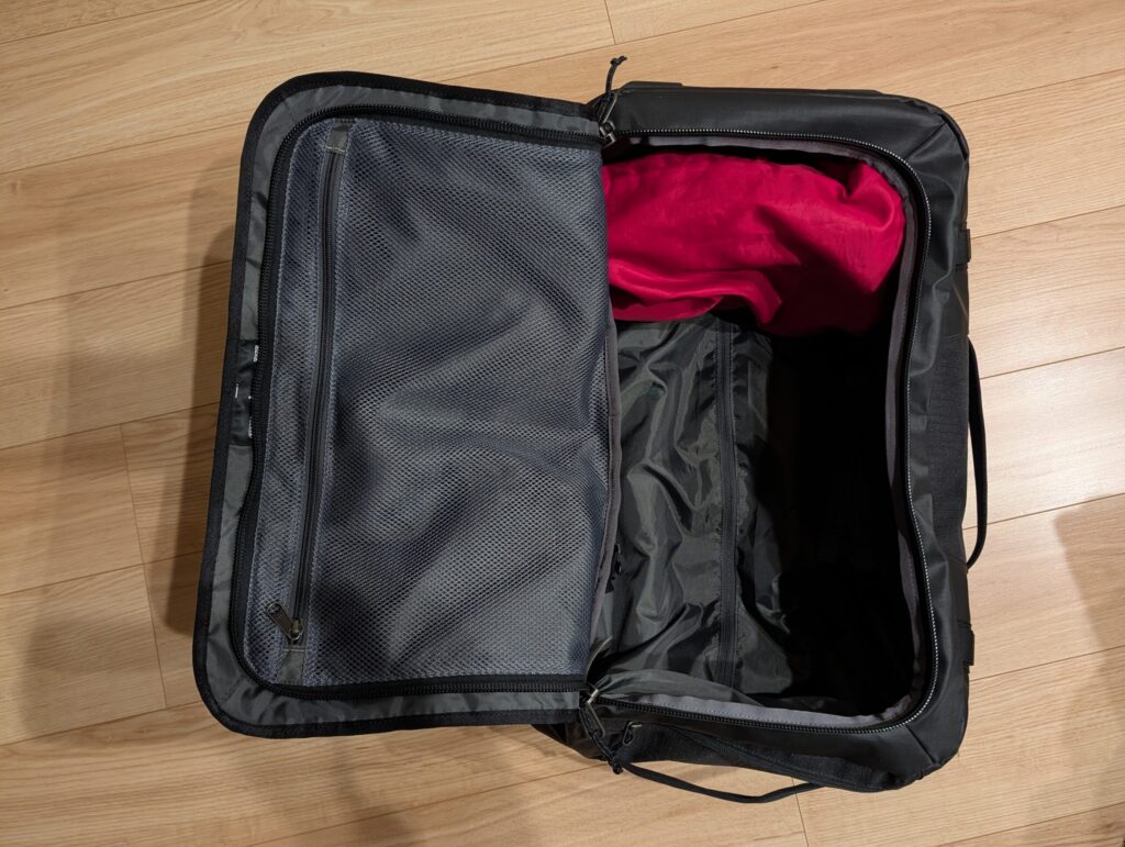 これだけの荷物を収納しても、まだ少し余裕があるほどです。ウィールド・ダッフル 40Lはスペースを無駄なく使える構造。衣類などの大きな荷物をダッフルに、PCなどの精密機器はリュックにと分けることで、身軽かつ安全なパッキングが完成します。